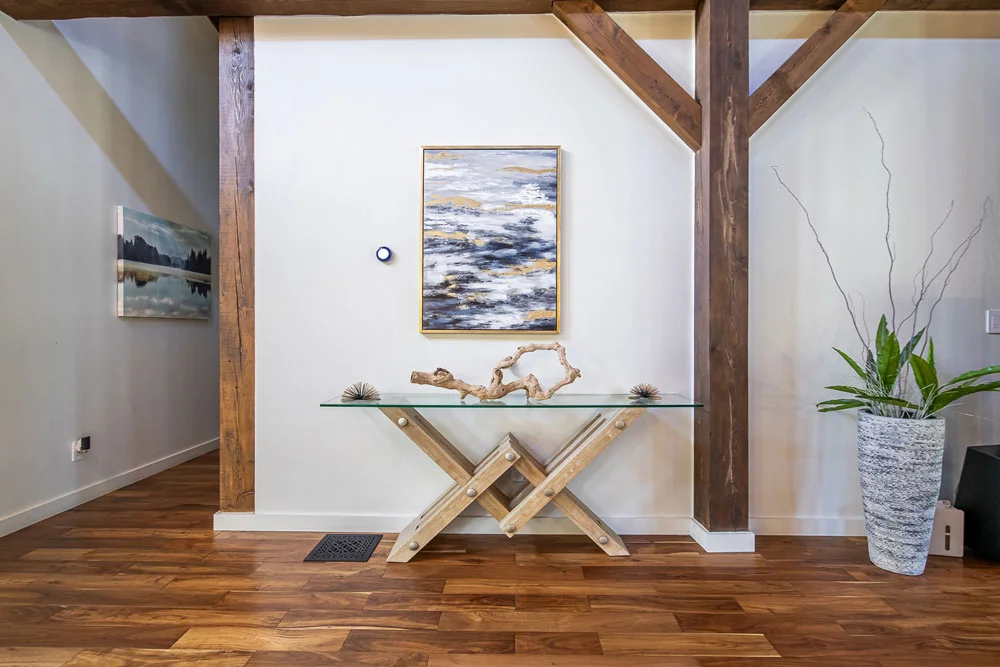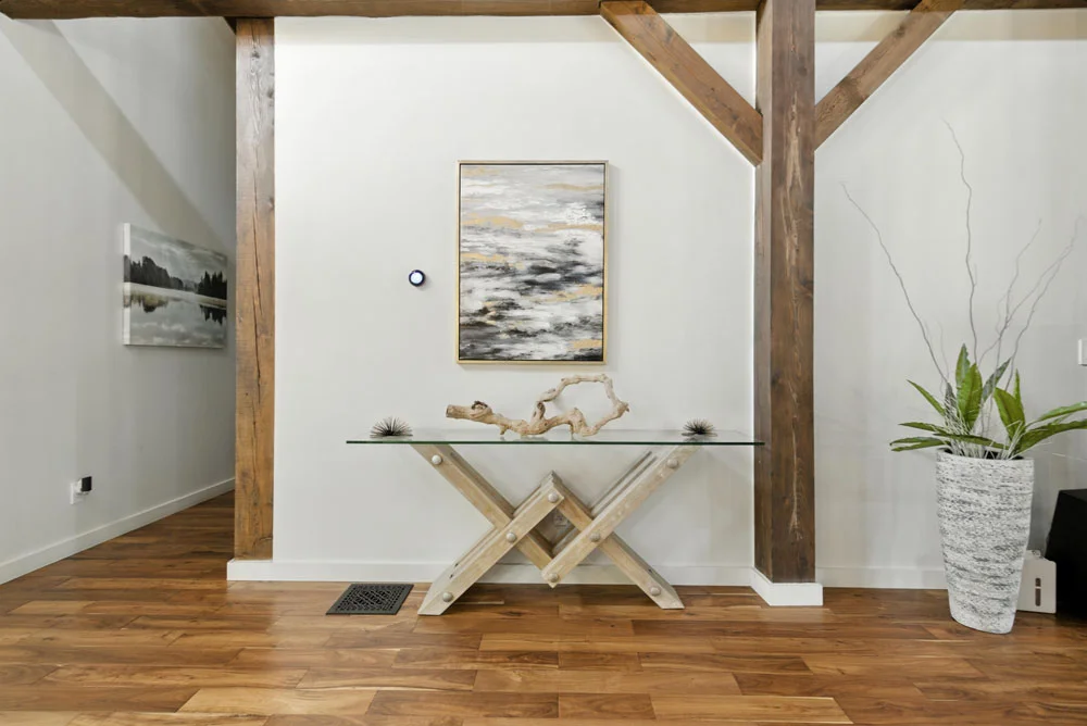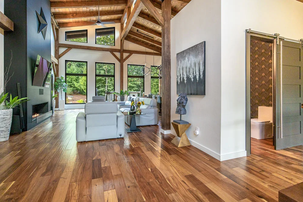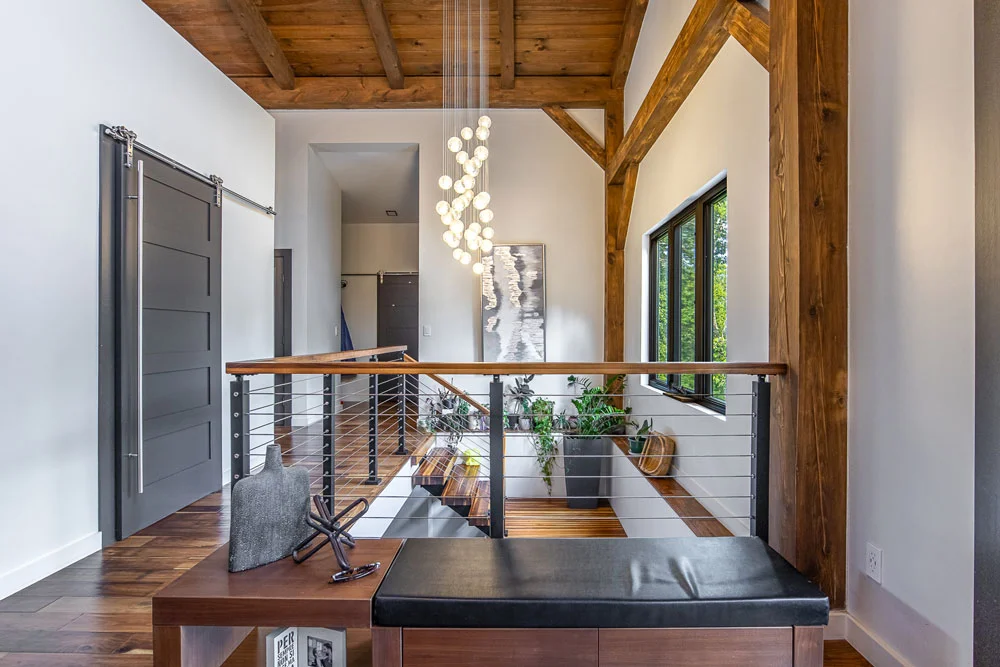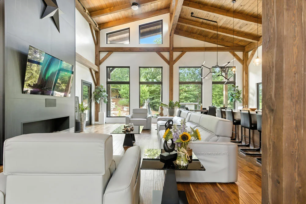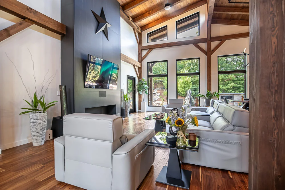 Rather than scaling back the vision, our design team embraced it. Their solution was to stagger the roof peak, which allowed us to utilize two massive timber plates layered together for exceptional strength. The approach provided the structural integrity required—yet also created something unexpected: a perfect clerestory for a row of windows high above the living space.