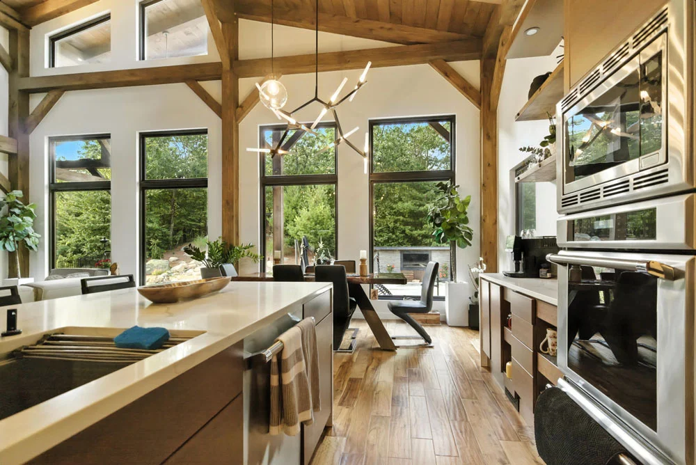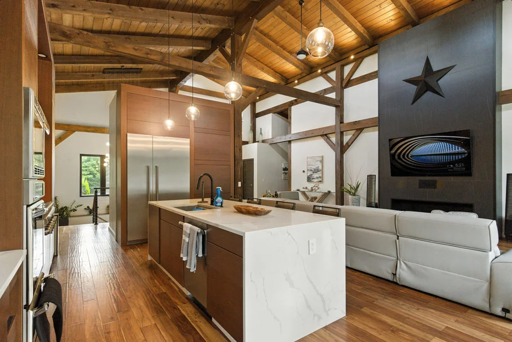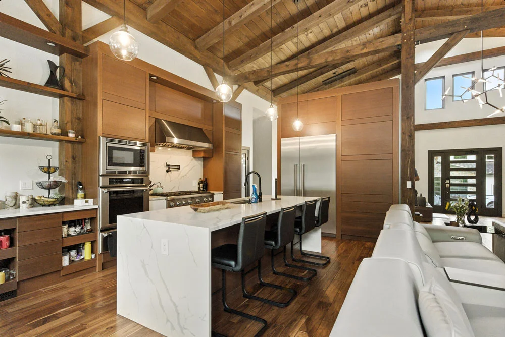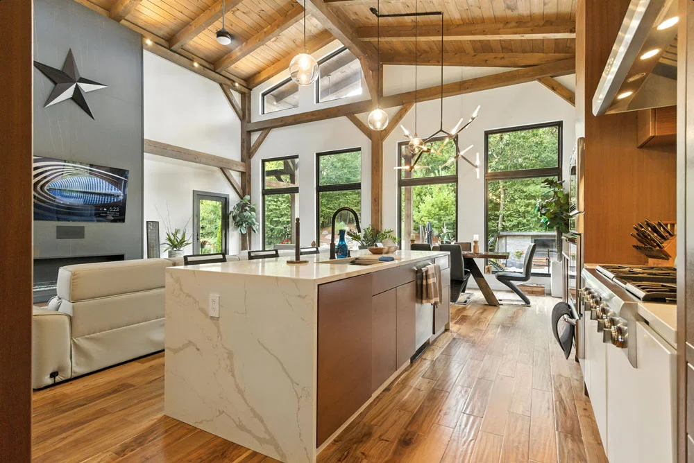 This marriage of necessity and beauty set the tone for the rest of the design. The Brookline blends the rugged textures of stone and exposed timber with the clean lines of a contemporary roofline and a state-of-the-art kitchen. The result is a space that feels at once like a modern gallery and a classic mountain lodge.